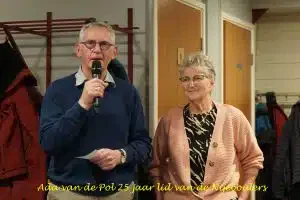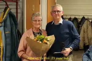 Tevens werd Ada van de Pol gehuldigd voor haar 25 -jarig lidmaatschap. Ook Ad Kerstens, om gezondheidsredenen niet aanwezig, was 31 december 25 jaar lid en zal thuis zijn felicitaties ontvangen.